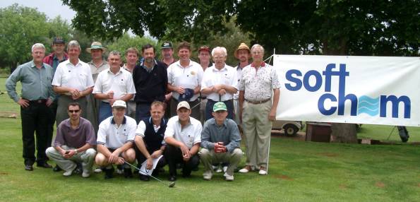 Participants present at the fifth Softchem Invitational Golf Day held at Magalies Park Country Club on 26 October 2001. Back: Johan Oosthuizen (Waterops), Pieter van der Merwe (PiLog), Prof Wim Skinner (University of Pretoria), Buks du Toit (Eskom), Hilton Behrendt (Behrendt and Associates), Vic Jonck (Eskom), Darryl Moss (Degrémont), Chris Barclay (Eskom), Carl Manser (Eskom), Wodge Satchwell (Lyons), Prof Uys Grimsehl (University of Pretoria), Francois Celliers (SABS), Peet Meintjes (Meintjes and Retief). Front: Wayne Storey (Degrémont), Braam Raubenheimer (Eskom), Francois Friend (Softchem), Wouter Hugo (Meintjes and Retief), Adriaan Smuts (City Council of Pretoria). Not on photo: Dr Pieter van Brakel. |