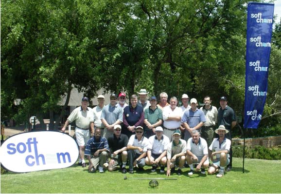 Participants present at the ninth Softchem Invitational Golf Day held at Magalies Park Country Club on 28 October 2005. Back: Johan Oosthuizen (Waterops), Peet Meintjes (Meintjes and Retief), Neels Uys (Municor Online), Neville Lichtenstein (Absa), Butch Retief (Meintjes and Retief), Pieter van der Merwe (Pi-Tech), Dr Pieter van Brakel, Kobus Jonck (BKS), Koos Hugo (Meintjes and Retief), Wim Skinner (University of Pretoria), Wouter Hugo (Meintjes and Retief), Darryl Moss (Sterizone), Mark Rowand (SIAnalytics). Front: Simon Xaba (Rand Water), Norman Keel (Ultimate Bond), Francois Friend (Softchem), Braam Raubenheimer (EIMS), Craig Pattison (Nedbank), Hilton Behrendt (Behrendt and Associates), Francois Celliers (TUV). |